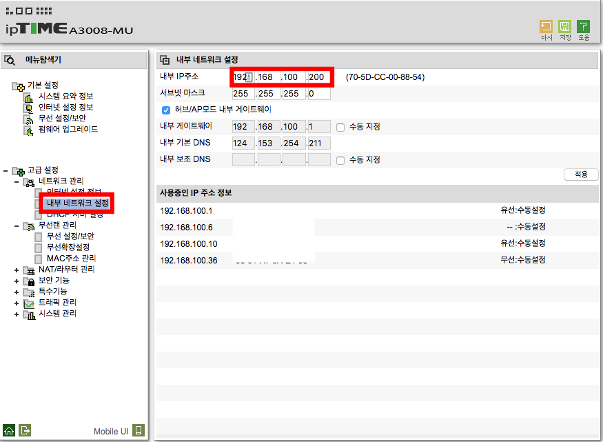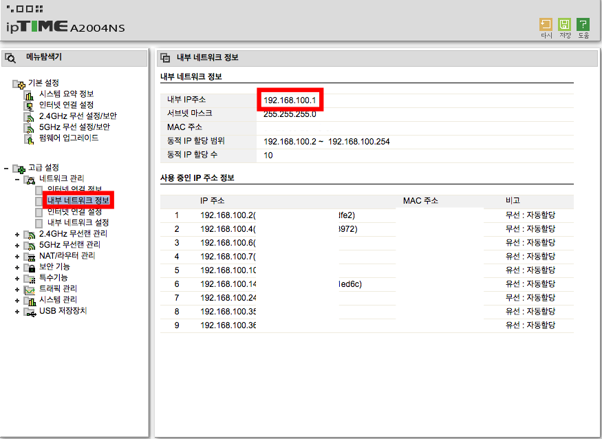우선 메인공유기에 접속을 해주시고, 아이피주소를 확인해주세요. 공유기설정 - 내부 네트워크 정보에서 내부 아이피 주소를 확인할 수 있습니다.