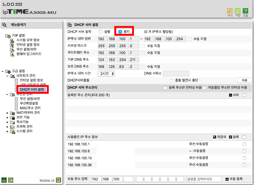 보조공유기 설정에서 DHCP 서버 설정 - DHCP 서버동작에서 중지를 선택해주시기 바랍니다. 아래 화면은 공유기 마다 조금 씩 화면이 다르게 나타나니 화면이 다르게 나타난다면 참고만 하셔서 DHCP 서버 동작부분을 중지해주세요.