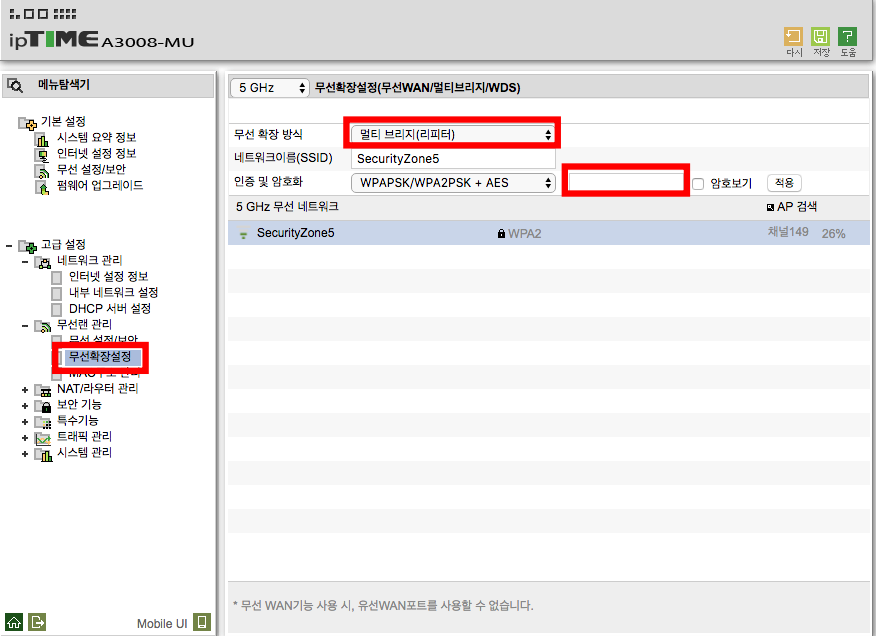 위 사진의 경우 5Ghz 로 확장을 하였으며, 무선 확장방식을 멀티브리지(리피터)로 메인 공유기의 SecurityZone5를 확장하였습니다. 비밀번호가 있다면 인증쪽 암호필드를 입력해주세요. 무선네트워크는 AP검색으로 찾으실 수 있습니다.