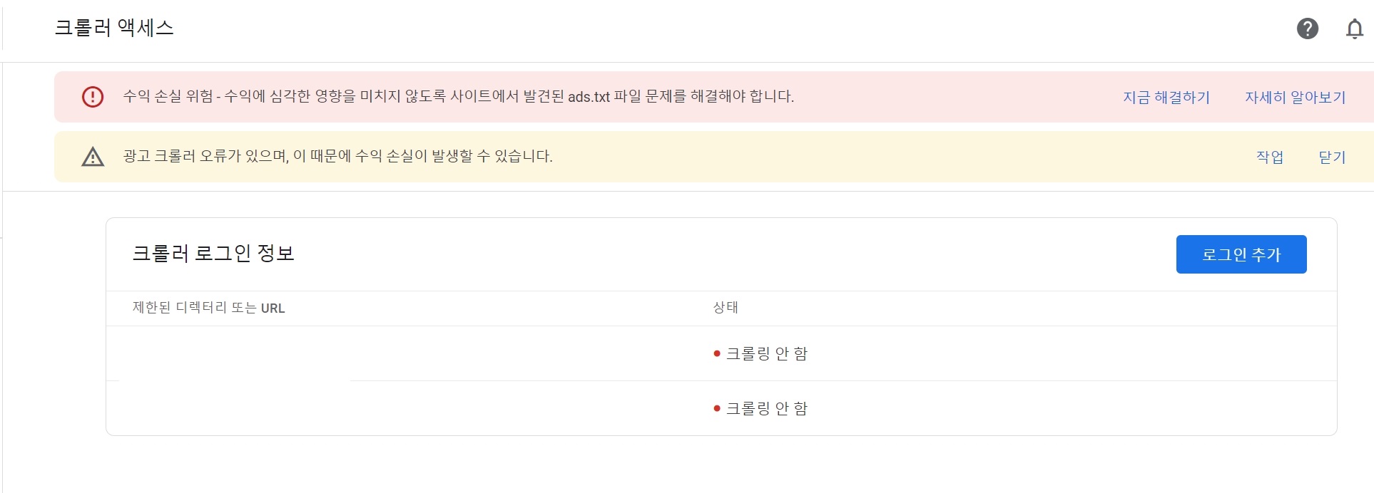 애드센스 계정 - 엑세스 및 승인 - 크롤러 엑세스 항목에 접근하여 주시고, 사이트 추가를 해주세요. 그러면 아래와 같은 화면을 보 실 수 있습니다.