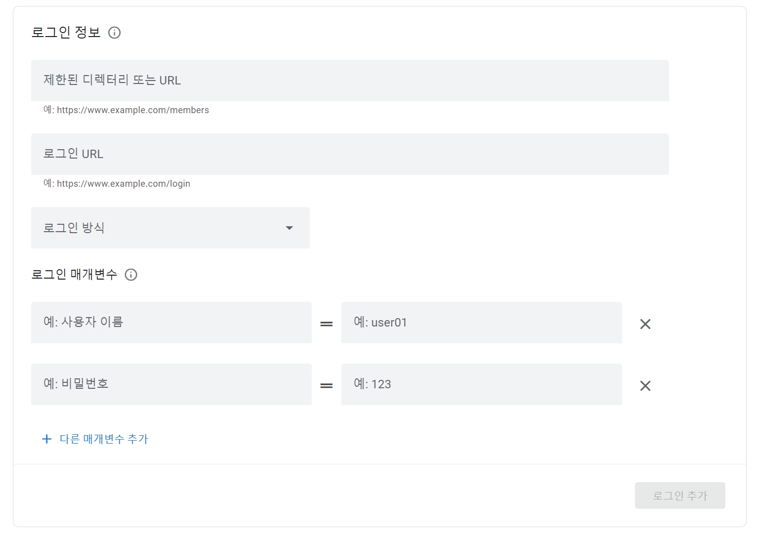 제한된 디렉토리 또는 url 항목에는 문제가 생긴 url을 적어주셔고, 로그인 url은 티스토리 로그인 주소를 입력하여 주시기 바랍니다. [https://www.tistory.com/auth/login] 주소를 넣어주시면 되세요. 로그인 방식은 POST, 로그인 매개변수의 경우 아이디 비밀번호를 두개씩 넣어주시고 로그인 추가를 해주시면 됩니다.