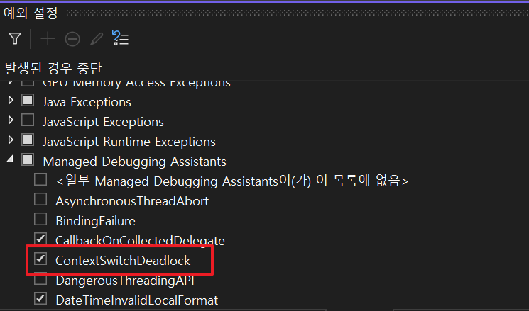 2. 예외설정의 ContextSwitchDeadlock을 체크해제 해주시면 됩니다.